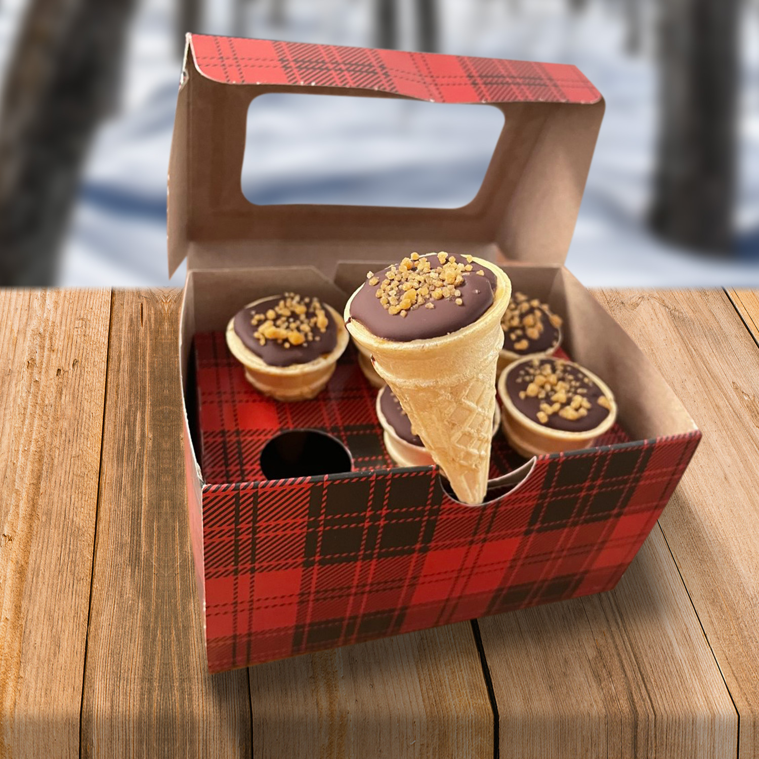 Possibilité de boîte mixte (cornets beurre d’érable + cornets beurre d’érable et chocolat noir belge).